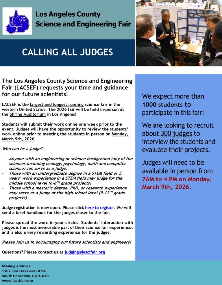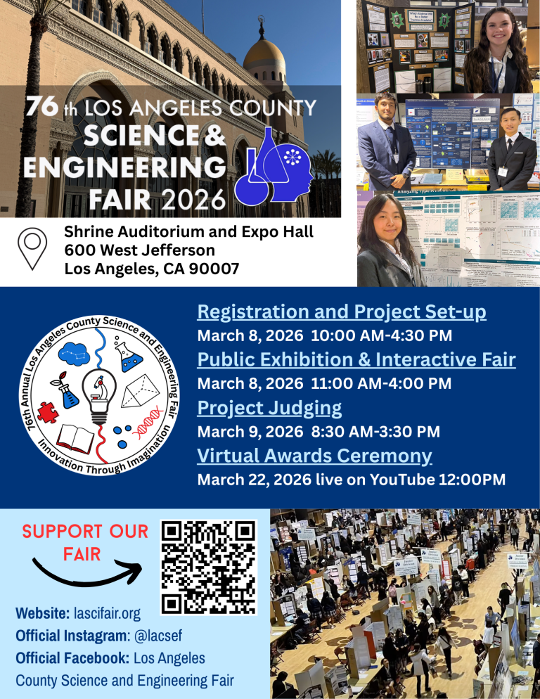 1,150 students from across Los Angeles County in grades 6–12 participated in the 2025 75th Annual Los Angeles Science & Engineering Fair. Congratulations to the Category Winners, Special Award Winners, and ISEF Delegates. Results were announced in March 2025 at the virtual awards ceremony available on YouTube.